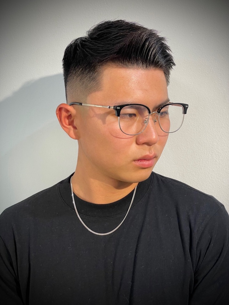 サイドと襟足は低めのテーパーフェード、トップは長さを残してコーム(櫛)で流すスタイルです。